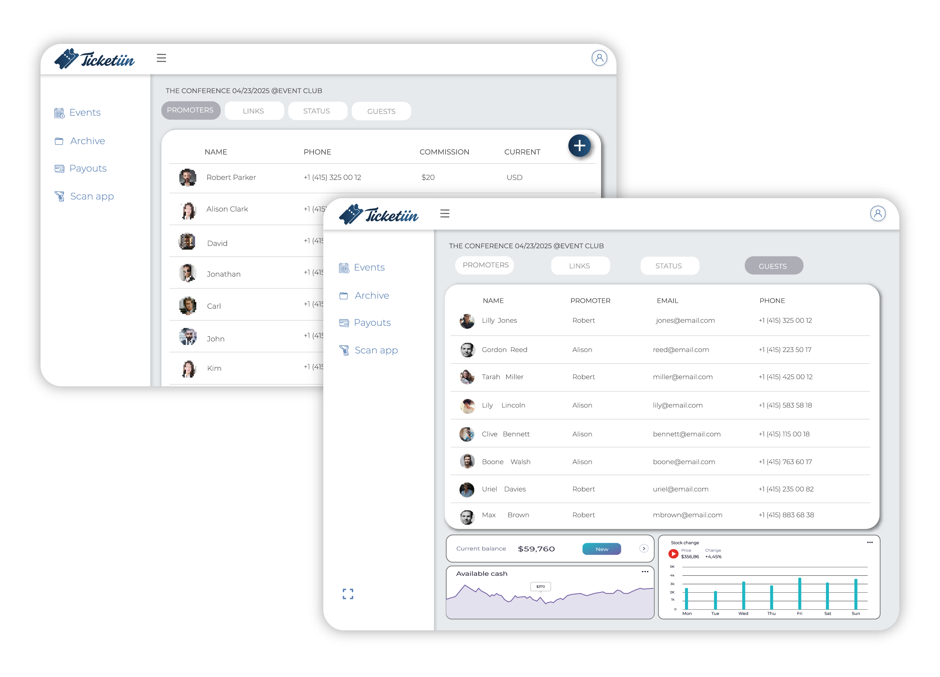 Get a list of your guests, see who attended the event and who is yet to come, which promoter referred each guest, also if your guests give you permission, you will get a list of their contact information, so you can contact them for your next events, See which print medium gave you the most results or which social network channel generated the most sales, also see which promoter of your team had the best performance.