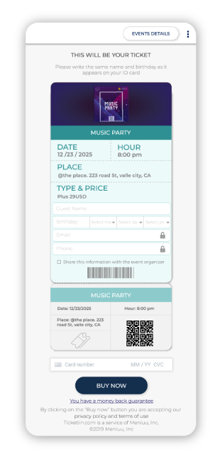 Whether they come through your print or digital advertising or from your promoters, your guests with a simple click can buy your tickets, without the need to download an app or create an account, making the conversion to attendees easy. You can customize what data to request to purchase your tickets, you can request as much data as you want or simply ask for their names, depending on the type of event you organize.